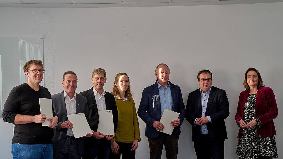 v.l.n.r. :Prof. Dr. Andreas Welling, TH OWL, Prof. Dr. Franz Kummert, Uni Bielefeld, Prof. Dr. Rolf Naumann, HSBI, Frau Dr. Amelie Bender, Uni Paderborn, Prof. Dr. Walter Sextro, Uni Paderborn, Minister Oliver Krischer, Regierungspräsidentin Anna Bölling